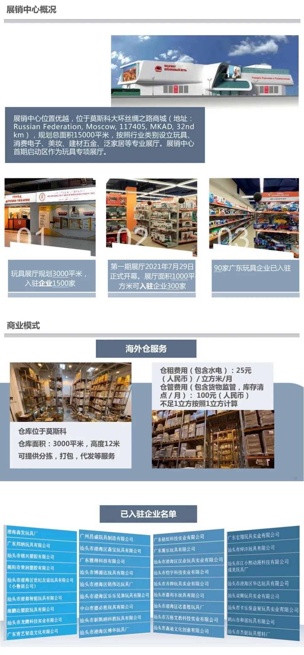目前,俄羅斯粵商會已在莫斯科建立總面積約 15000 平米的“俄羅斯廣東商品展銷中心”,為廣東品牌提供展示及 銷售的渠道和場地,打造廣東產(chǎn)品在俄羅斯的匯集地,并在莫斯科建立了超 3000 平米“廣東商品海外倉”,對接線上及線下平臺,為企業(yè)提供中俄清關(guān)、運(yùn)輸代理、倉儲、監(jiān)管、配送等服務(wù),并已幫助超過 200 家各行各業(yè)的民 營企業(yè)進(jìn)入俄羅斯市場。